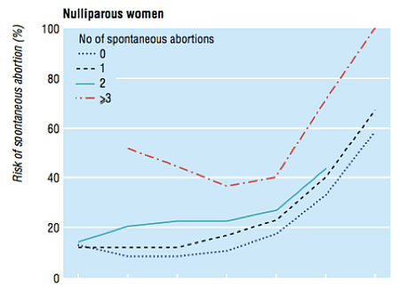 Mais pour les femmes de 35 ans et plus, ces études sous-estiment le risque de fausse couche. En particulier, même après confirmation d'un rythme cardiaque foetal, le risque de fausse couche est plus élevé pour les femmes de 40 ans et plus jusqu'à 12 semaines, selon une étude portant sur 384 femmes de plus de 35 ans.