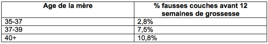 Risque de fausse couche selon l'âge de la mère au moment de la conception