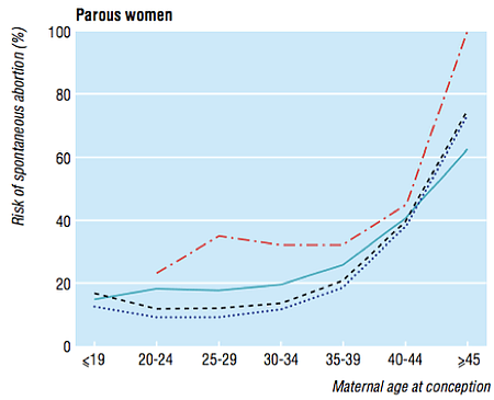 Le facteur de risque le plus important, comme on le sait, est l'âge de la femme : les taux de fausses couches augmentent avec l'âge, en particulier quand la femme approche les 40 ans. L'âge de l'homme est également important, surtout après l'âge de 40 ans. Anne-Marie Nybo Anderson, du Danish Epidemiology Science Center, a dirigé la plus grande étude démographique jamais réalisée sur l'âge et les fausses couches. Anderson a suivi tous les « résultats reproductifs » - chaque grossesse, fausse couche, naissance, mort in utéro ou avortement - au Danemark entre les années 1978 et 1992 - soit les résultats de plus d'un million de grossesses. Qu'a-t-elle trouvé ? Le risque de fausse couche augmente fortement à la fin de la trentaine et atteint près de 100% à 45 ans. Elle a également trouvé que le risque de grossesse extra utérine et de prématurité augmente avec l'âge.