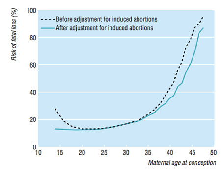 Cohen-Overbeek TE, Hop WC, den Ouden M, Pijpers L, Jahoda MG, Wladimiroff JW. Spontaneous abortion rate and advanced maternal age: consequences for prenatal diagnosis. Lancet. 1990 Jul 7;336(8706):27-9